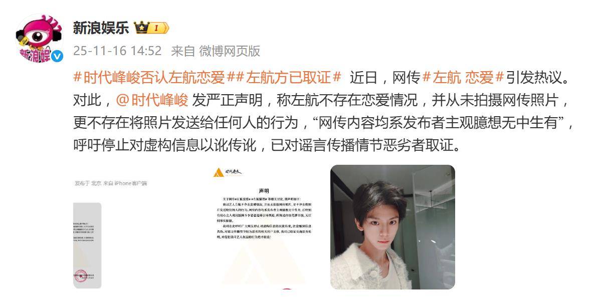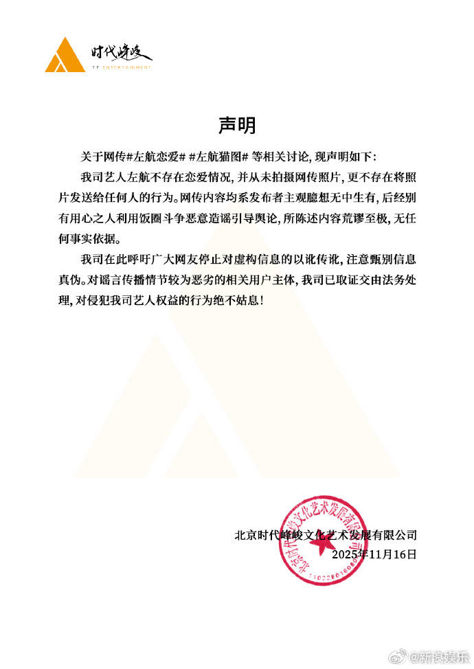 时代峰峻在11月16日的声明中措辞严厉,明确给事件定性:左航“不存在恋爱情况”,所有网传内容均为“发布者主观臆想、无中生有”。公司更是直接戳破所谓证据链,强调左航“从未拍摄网传照片”,更不存在将照片发送给任何人的行为——这相当于直接否认了网传“左航猫图”的真实性,将其定性为从头到尾的伪造产物。
