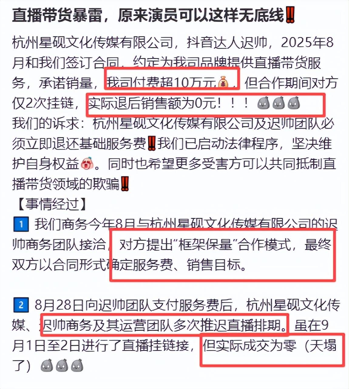 迟帅最近又坑了个商家,收了商家十多万元的带货费,却一直拖延直播。