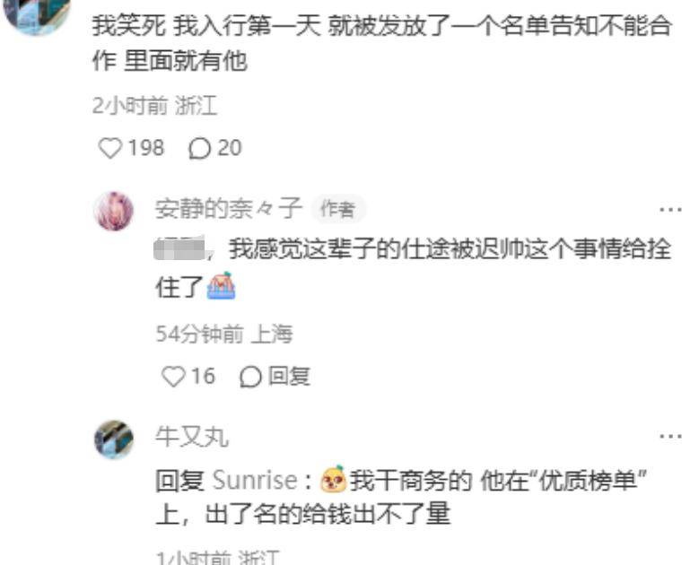 有意思的是,有网友随后在评论区里曝出,迟帅做这种事也不是一次两次了,他早已出现在一个业界流传的避雷黑名单上。