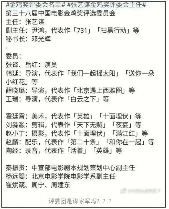 没办法,谁让评委喜欢呢?也有人说金鸡奖也不是张艺谋一个人说了算,可看看其他委员的名单,张译和张艺谋合作过多次。其他美术、编辑、摄影类的几乎都和张艺谋合作过,甚至早在《夜宴》《十面埋伏》《英雄》时期就合作过。纵观整个金鸡评委班底,说一句“谋家军也不为过”。