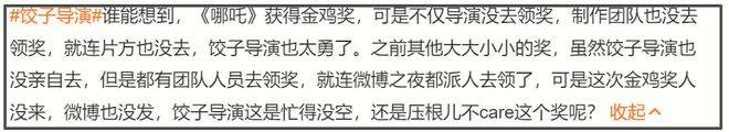 据悉,《哪吒2》斩获的是金鸡奖最佳美术片奖,作为一部动画片,这个奖项无疑是对它的极大肯定。可网友发现之前大大小小的奖项,饺子导演因为闭关未能亲自前往,但一般会派团队人员代领。但这次非但人没来,微博也没发。网友也不禁想问:饺子导演这是忙得没空,还是压根不在乎这个奖了?