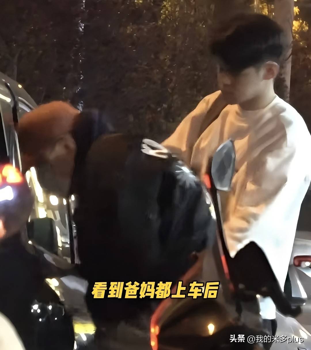 朋友开车来接他们一家三口,大儿子表现得很懂事,先让父母上车,自己则抱着外套站在后面等候。陈建斌和蒋勤勤坐在后排,虎虎则打开前门坐在副驾驶位置,这样的座位安排看来已经成了惯例,孩子也习惯了。