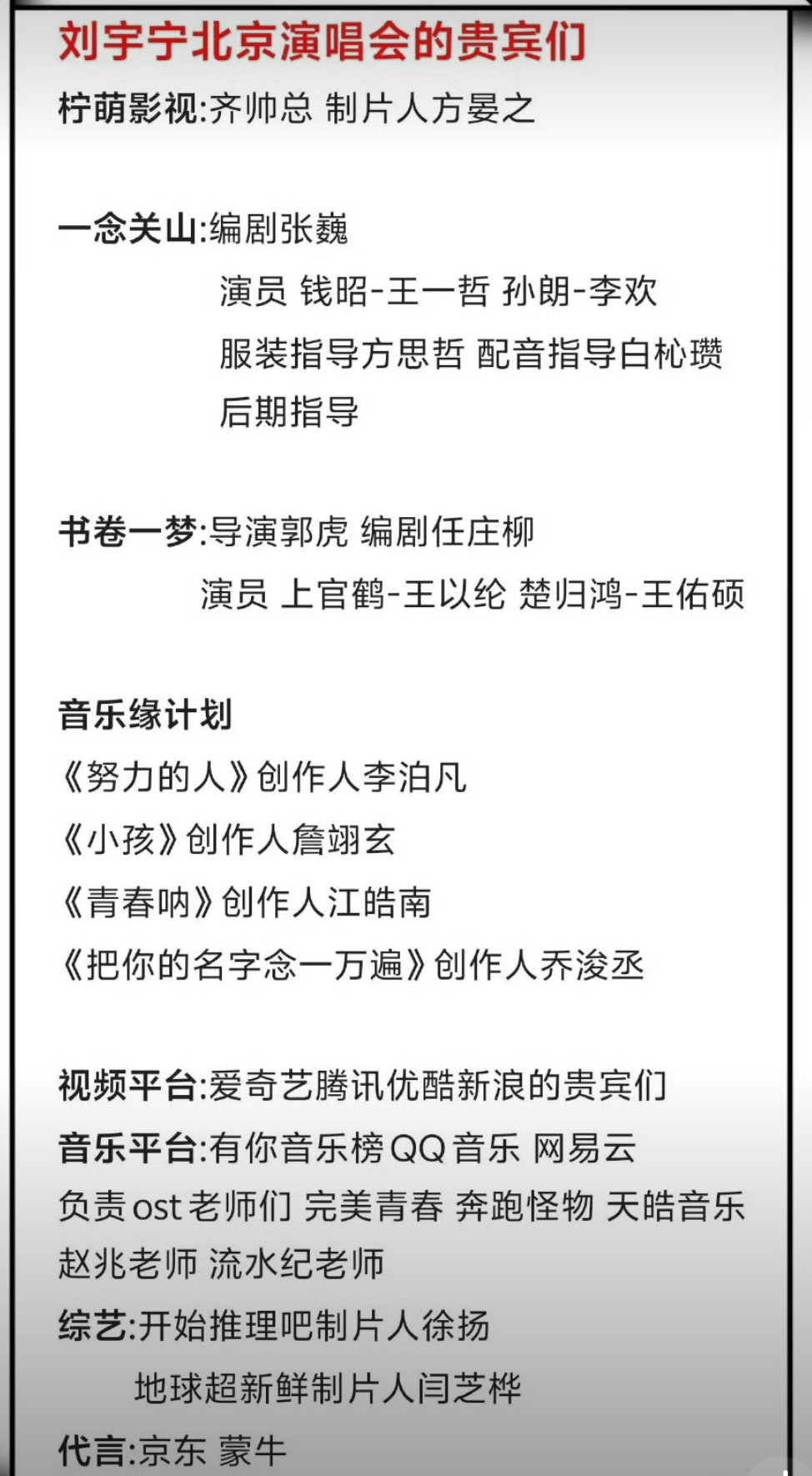 11 月 15、16 日,刘宇宁在北京工体连开两场演唱会,本意是“宠粉”,结果秒变“内娱顶配团建”。两天 80+ 位真·大佬到场打卡,影视、音乐、平台三大