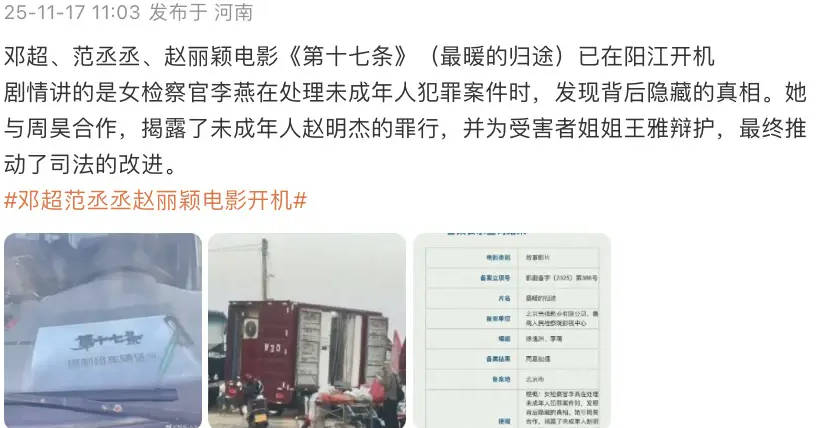 11月17日,网传邓超、范丞丞、赵丽颖《第十七条》电影已在阳江开机。随后赵丽颖工作室发文打假,否认该消息!