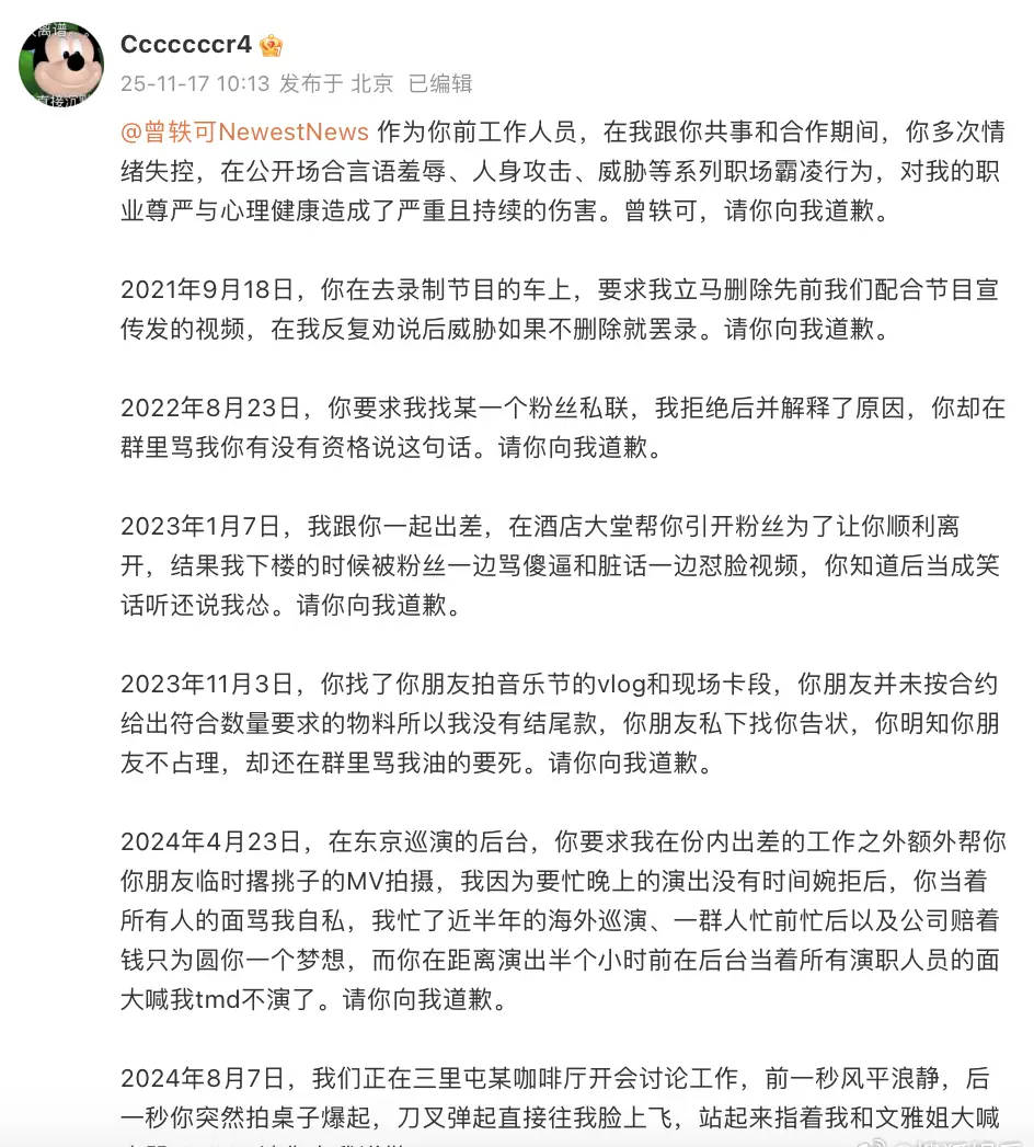 11月17日,曾轶可前工作人员发长文控诉曾轶可,称其在共事期间多次情绪失控,不仅让工作人员主动私联粉丝、要求工作人员24小时待命,还多次对工作人员进行言语羞辱、人身攻击、威