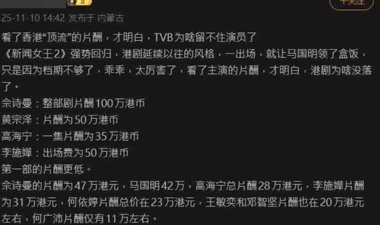 TVB剧《新闻女王2》播出后掀起观众追看热潮,近日有内地网友曝光剧中演员的薪酬表,称佘诗曼接拍《新闻女王2》片酬100万,黄宗泽则仅收50万,有网友留言调侃:“黄宗泽性价比太
