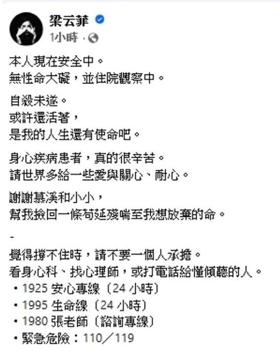 梁云菲亲自在社交网报平安,称目前已无性命之忧,仍在医院住院观察。对于这次历经生死,她坦言是自杀未遂:“自杀未遂。或许还活着,是我的人生还有使命吧。”她感谢两位好友救回了自己这条本想放弃、苟延残喘的生命。
