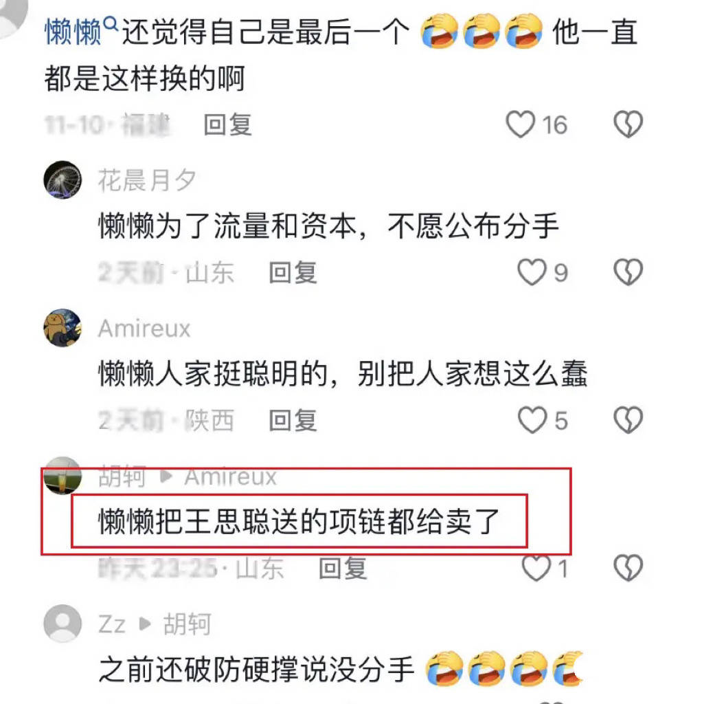 也难怪懒懒会觉得自己是最后一个,毕竟她在王思聪这里得到了很多。可懒懒本人也不缺钱,公然变卖王思聪送的礼物,只有一个可能就是俩人已经分手了。