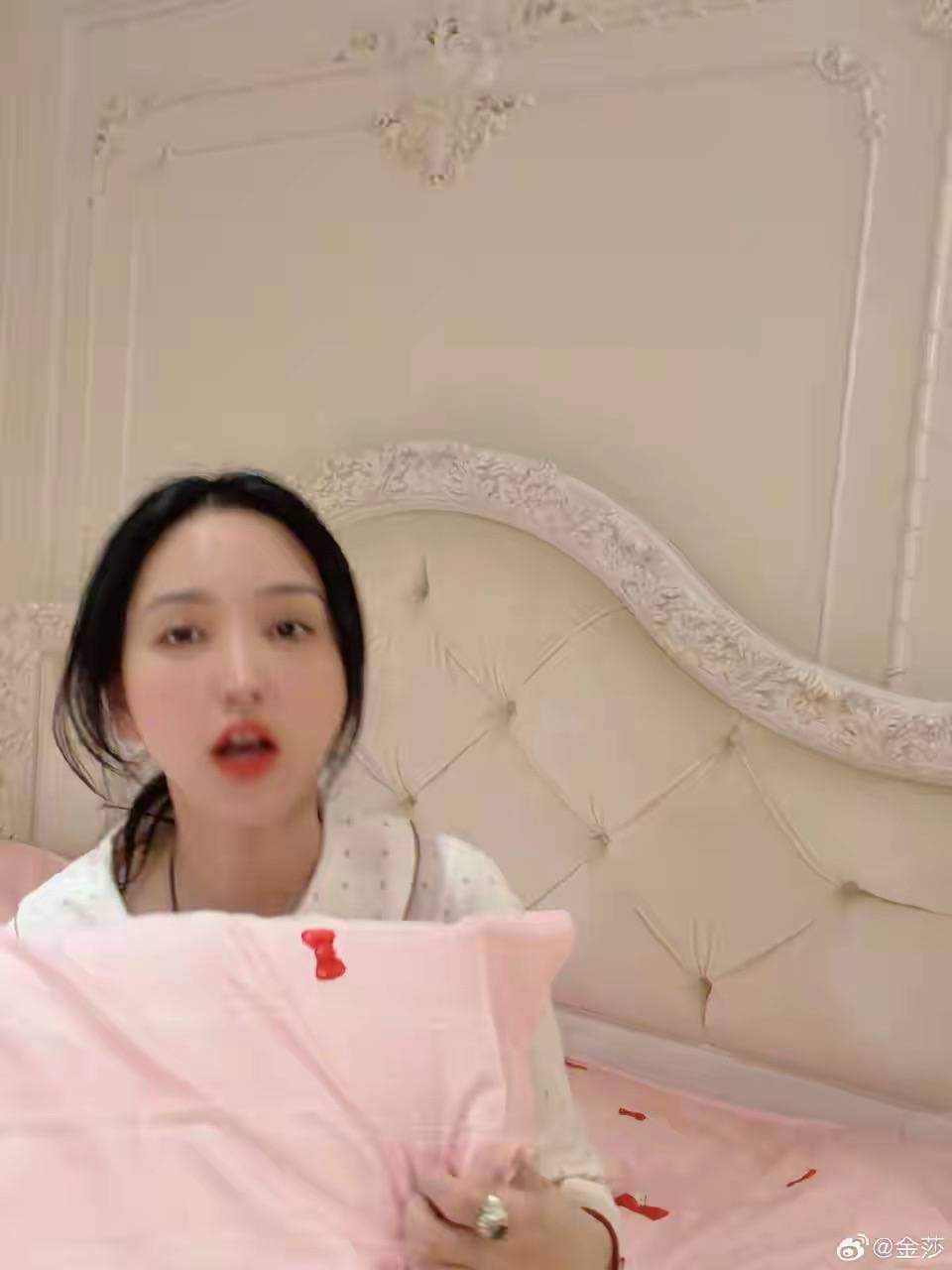 在背景里,可以看出金莎的闺房非常有小女心。粉色的四件套,还点缀了蝴蝶结的图案,可可爱爱的。