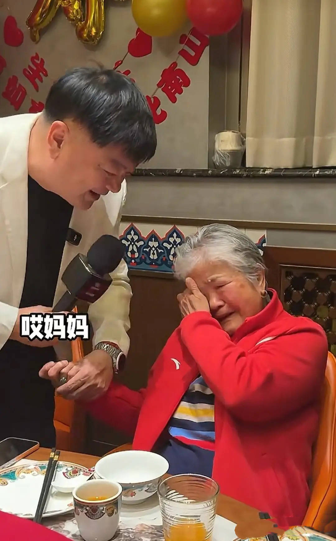尤其是洪剑涛还感恩了自己的母亲、以及已故的老父亲。洪剑涛的母亲应该得八十来岁了,她穿着一件红色外套,看着非常喜庆。儿子暖心的话语,让老母亲的感动得落泪了。