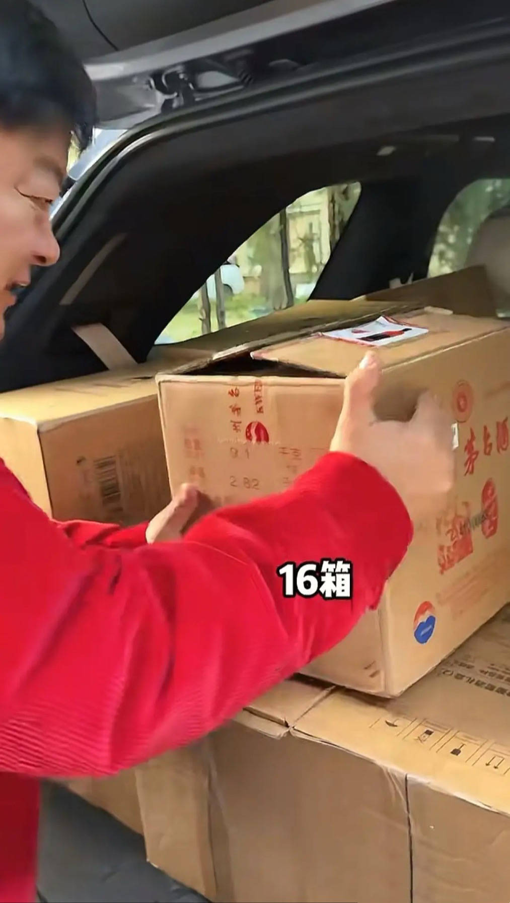 新车到手,洪剑涛一定要先试试手感。于是立马要开车去赴宴了,他搬了足足16箱茅台酒放在后备箱里。