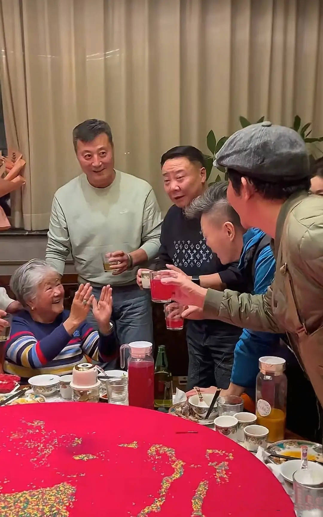 可能是房间里太热的缘故,后来老太太就脱掉了外套。洪母年纪大了,但精神头很好,洪剑涛的好友们都跑过来给老太太敬酒,画面特别的温馨。