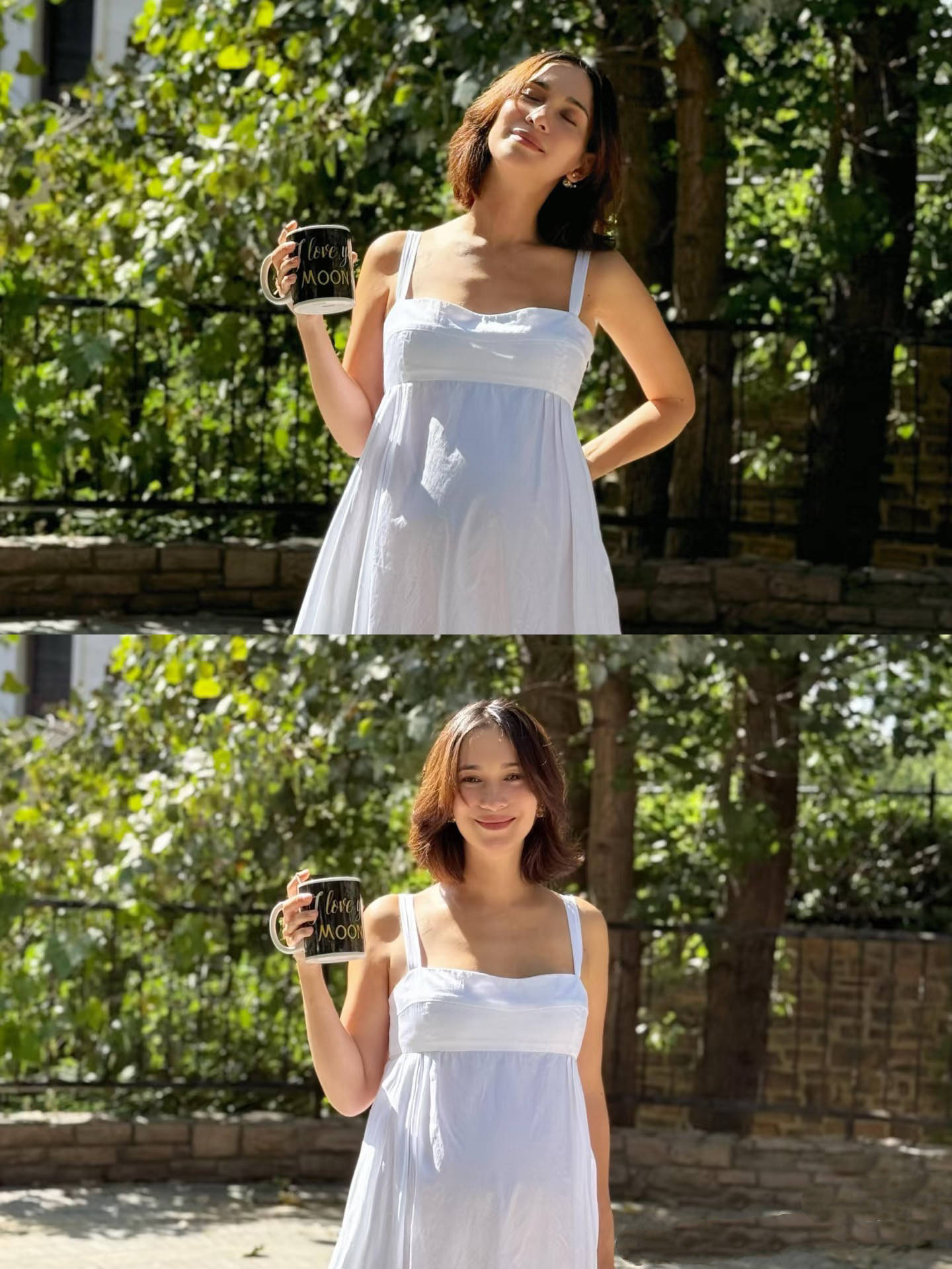 卢靖姗整个孕期,基本没有长什么肉。他穿着吊带裙的时候,手臂还是很纤细、肩颈线也超完美,还能看到优越的锁骨线条。