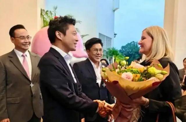 婚礼上,霍启仁穿了一件黑色西装,他和Namfon一起在欢呼,能看出他的开心,而Namfon也是笑得爽朗,一对新人都很大大方方,享受自己的婚礼,现场氛围也特别好。