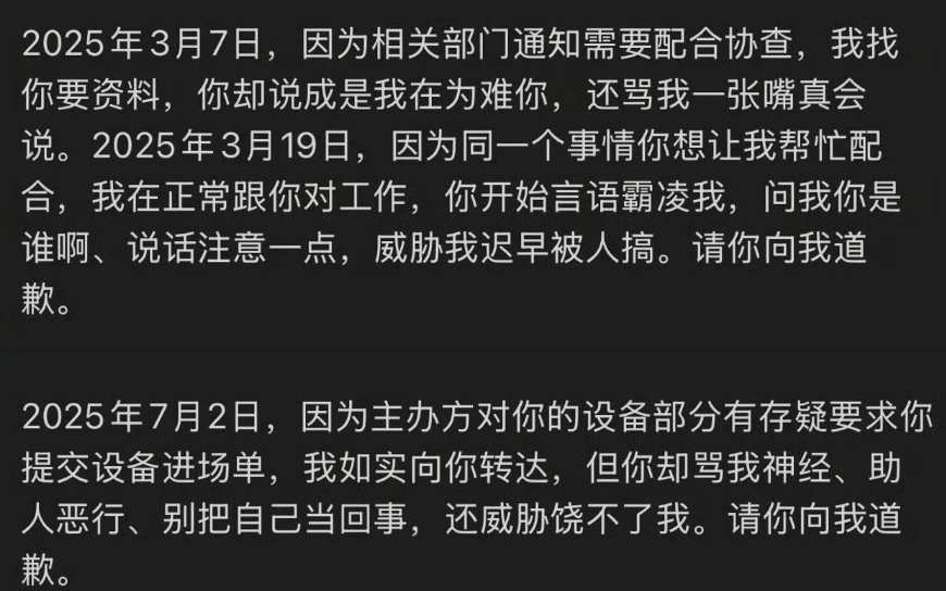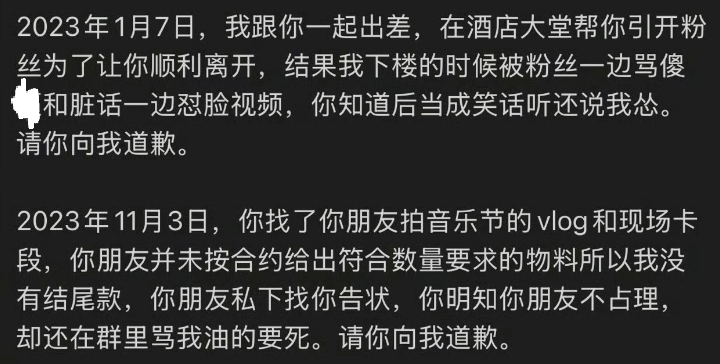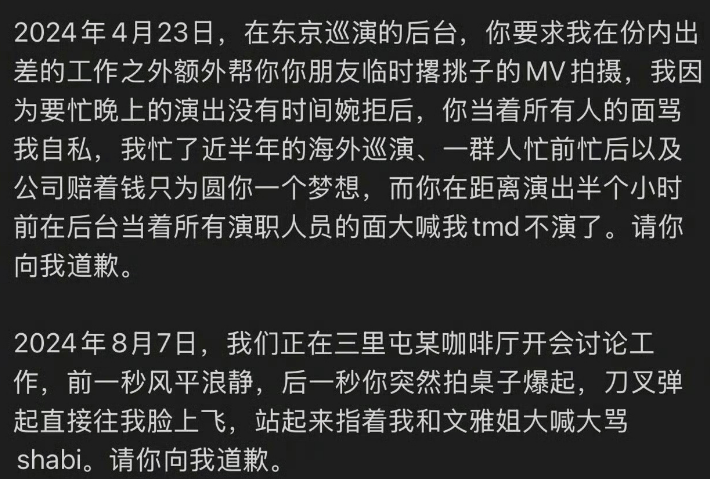 自称曾轶可前工作人员的网友发文爆料啦!其发布长文列举了13个发生在工作期间的霸凌事件,包含工作期间情绪失控、让工作人员私联粉丝等,要求曾轶可向其公开道歉。而且,该爆料人