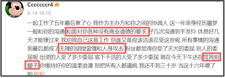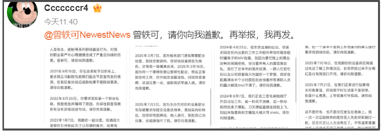 自称曾轶可前工作人员的网友发文爆料啦!其发布长文列举了13个发生在工作期间的霸凌事件,包含工作期间情绪失控、让工作人员私联粉丝等,要求曾轶可向其公开道歉。而且,该爆料人还喊话曾轶可不要再举报了,会坚持发声,可见其维权困难。