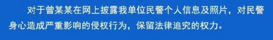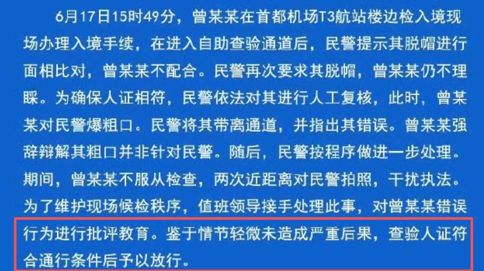 事后警情通报还了工作人员清白,称工作人员只是公事公办,是曾轶可不遵从检查规定且偷拍,干扰执法,因未造成大影响对其进行口头教育并放行。针对其公开警号及照片等行为,将保留法律追究权利。