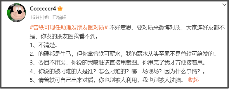 综合来看,爆料人的态度和措辞都很刚硬,曾轶可方就显得不够有力,不仅不公开回应,还让助理朋友圈喊话。当然,曾轶可是否参与了职场霸凌还需要更切实的证据,请爆料人放证据。