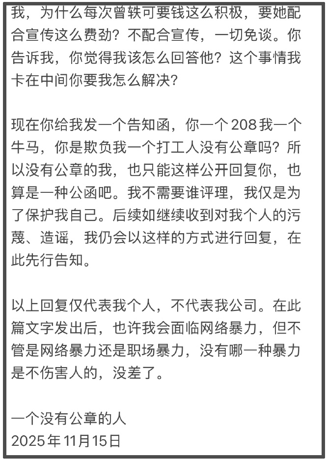 而最近的两篇长文则详细明确主人公是曾轶可,且态度强硬。爆料人先发文交代自己已离职,但收到曾轶可及公司发来的告知函,以此威胁爆料人闭嘴。但爆料人认为曾轶可方的主张不是事实,称其一年内已经发了9个告知函,其中包括带章和不带章。