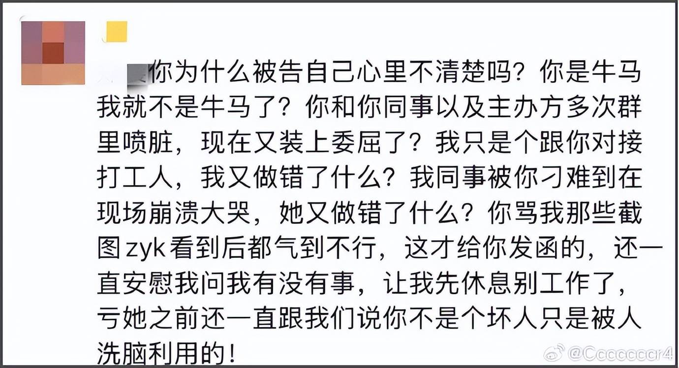 针对霸凌控诉,曾轶可现任助理站出来回应了,她在朋友圈发文炮轰爆料人被告活该,指责爆料人多次在工作群喷脏,刁难同事,曾轶可受不了现任助理被骂才发函。之后,爆料人强势回怼,表示自己薪水并非曾轶可支付,并让对方晒喷脏等截图公开对质,或者直接曾轶可出面,委屈从来不用装,让现任助理别被洗脑了。