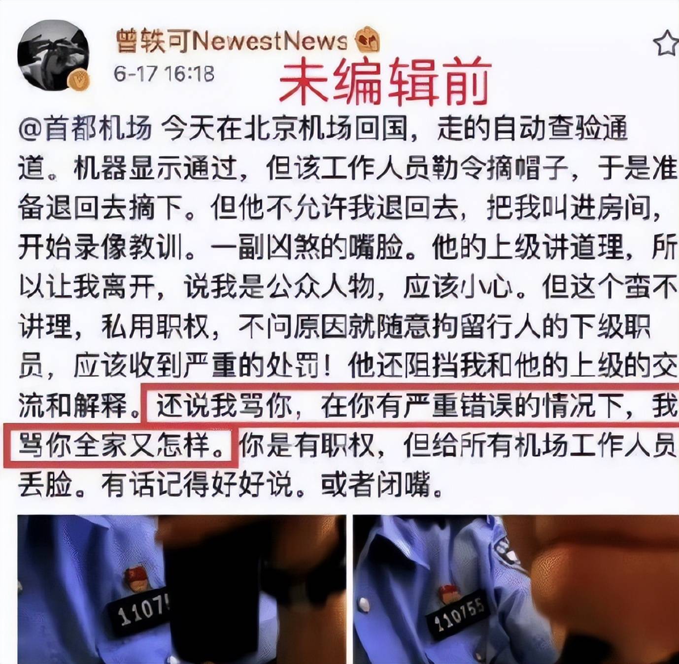 看到爆料人的控诉,有网友提起曾轶可曾引导粉丝网暴警察的旧闻。当时,曾轶可因为安检问题大闹机场,偷拍了工作人员警号,发文称工作人员滥用职权应该受到惩罚,对于“辱骂工作人员”的事不以为耻还自诩有理。