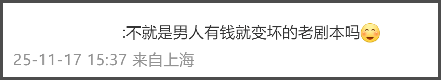 评论区有人怀疑,这不会是男人有钱就变坏的老剧本吧?