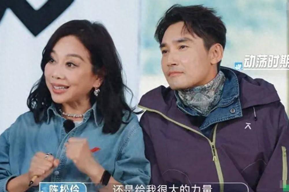 与之对比的陈松伶与张铎,差异顿时显现。张铎46岁,笑容轻快,精神饱满,镜头中他总是步伐迅速,反应灵敏。而陈松伶的面部特写中,肌肤纹理明显,苹果肌的起伏呈现层次感,五官在表情变动中有些不对齐,脖部的纹路随着低头更加明显。她的神态在松弛与紧张之间转换,让镜头捕捉到了真实的变化。两人站在一起,年龄差异虽然是9年,但更多的是状态的差距,画面一对比,观众很容易被吸引到这些细节上。