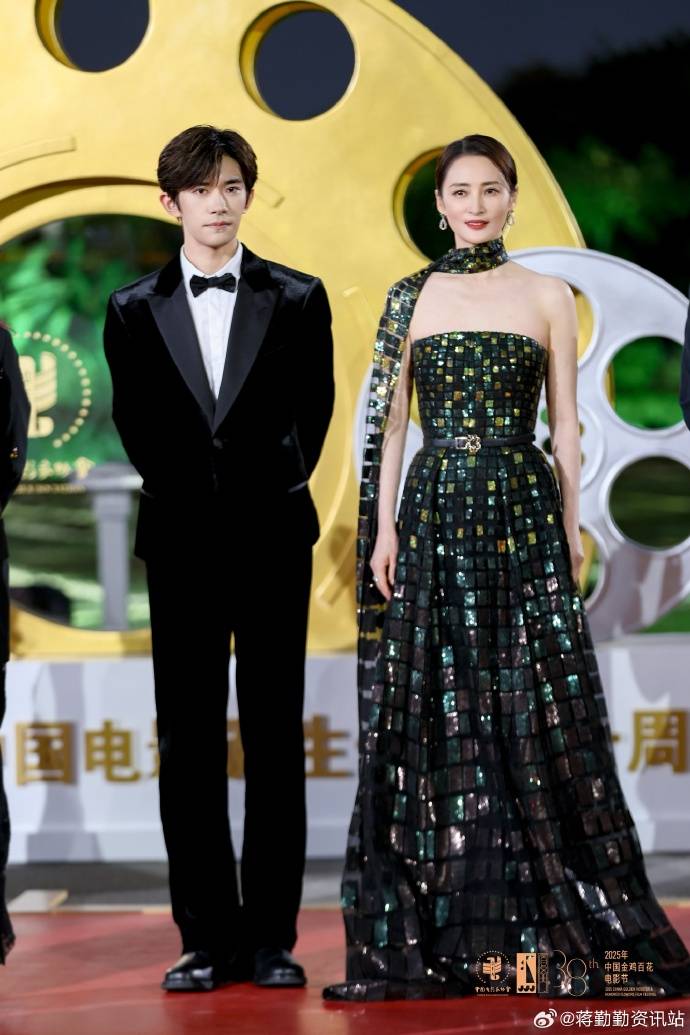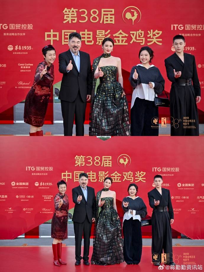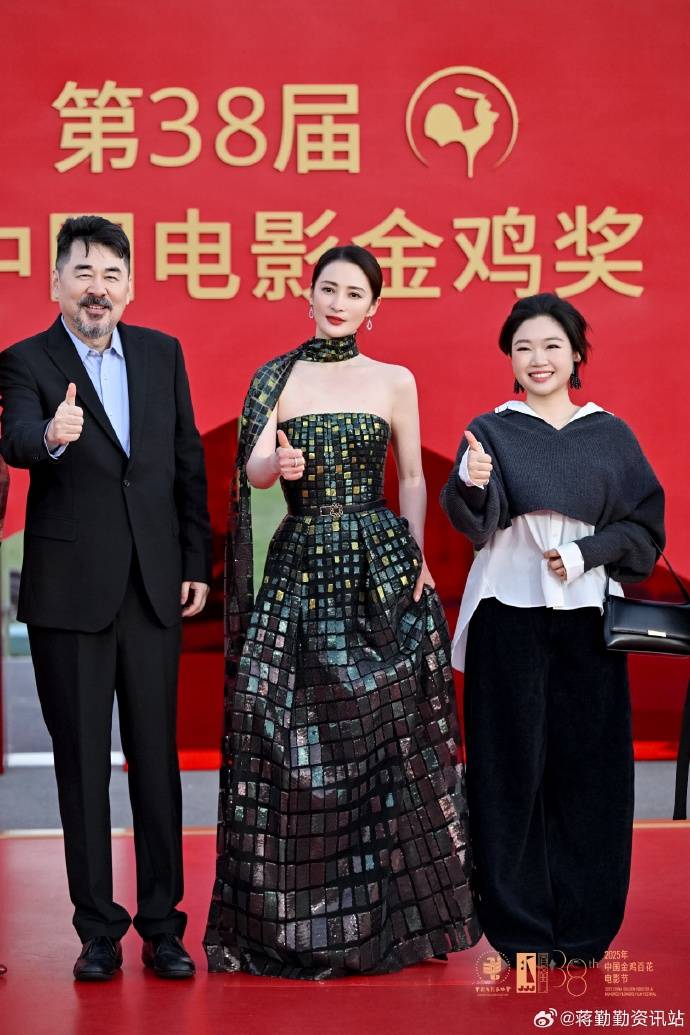 在金鸡奖闭幕式(11月15日)红毯上,蒋勤勤身着藏蓝套装,胸针点缀提升霸气感,水墨风剪影勾勒东方风骨。裤装设计打破传统裙装定式,强化力量感。