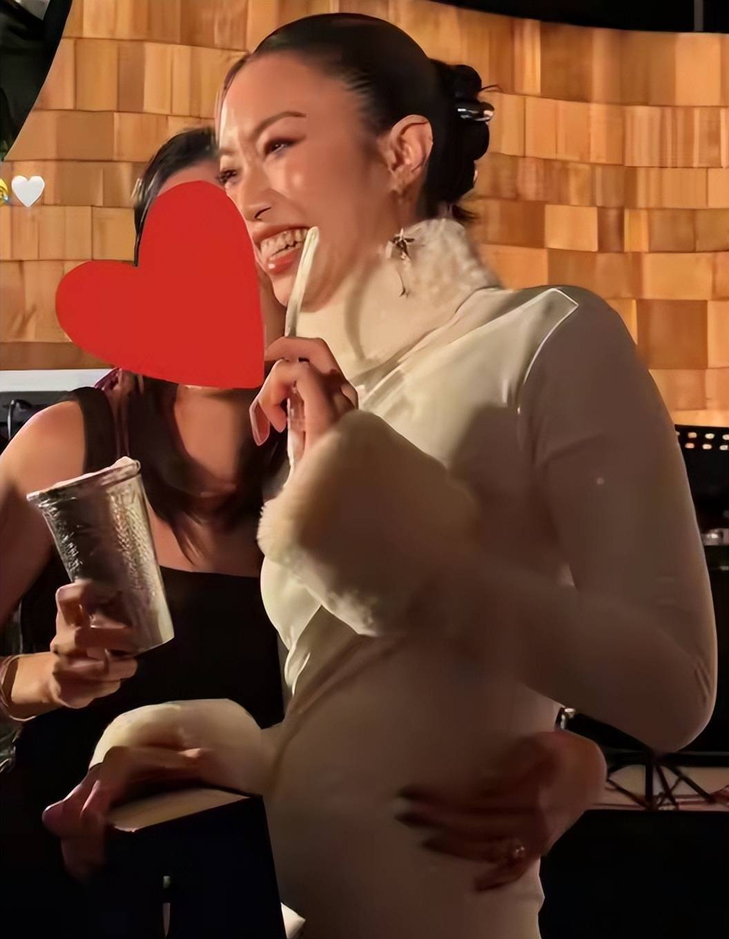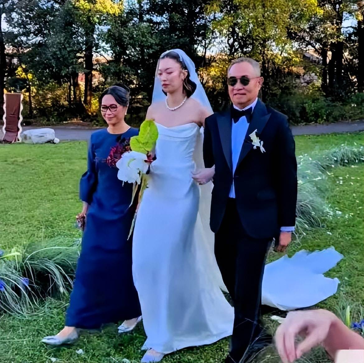 新娘Namfon身穿高领白色修身礼服,盘发造型典雅,被指气质神似婆婆朱玲玲。多张照片显示其小腹隆起,引发“奉子成婚”猜测,但霍家未官方回应。