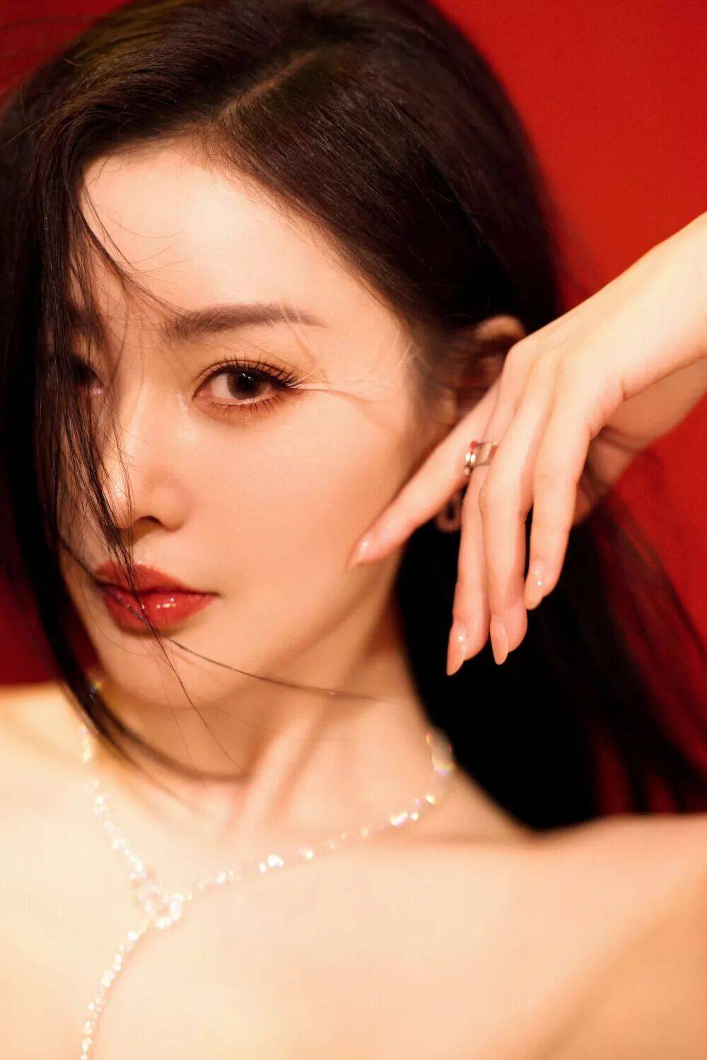 张天爱穿着红色吊带衣裤,她俏脸成熟妩媚,乌黑的秀发飘逸,露出白皙的香肩和事业线,绝对性感撩人!