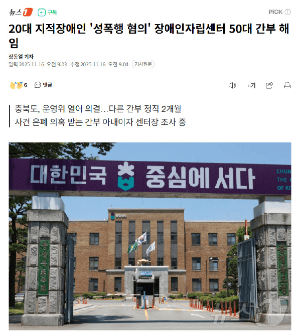 忠清北道某残疾人自立生活中心50多岁干部A某,被控长期性侵一名20多岁智障女性,以"咨询"为由作案。A某还涉嫌猥亵受害者的姐姐,对方同为重度智力障碍者。