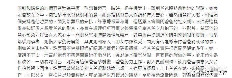 “爸爸很听我的话,小时候他忙工作,现在一起拍片很珍贵。 ”许惠菁谈到和父亲拍短视频时,终于有了一丝笑容。 这些视频如今成了她最珍贵的遗产。
