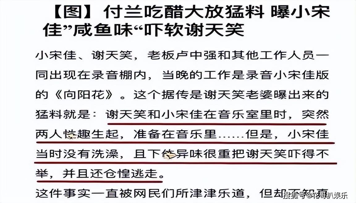 如果是吃瓜群众吃瓜就算了,结果正主也下场了,谢天笑的妻子付兰突然发文暗讽宋佳介入自己的婚姻,还嘲笑宋佳身上有一股咸鱼味儿,老谢受不了被熏跑了。这么劲爆的内容就这么水灵灵说出来了,直接导致微博服务器瘫痪,“宋佳下体异味”的词条以病毒式传播速度冲上热搜榜首。当时的网友们可没有现在网友素质高,好不容易遇见个大瓜吐槽起来可以说是五花八门,从“咸鱼味儿”延伸出“海鲜味儿”“鱼子酱味儿”等搞笑说法,当时各大论坛的讨论热度居高不下。