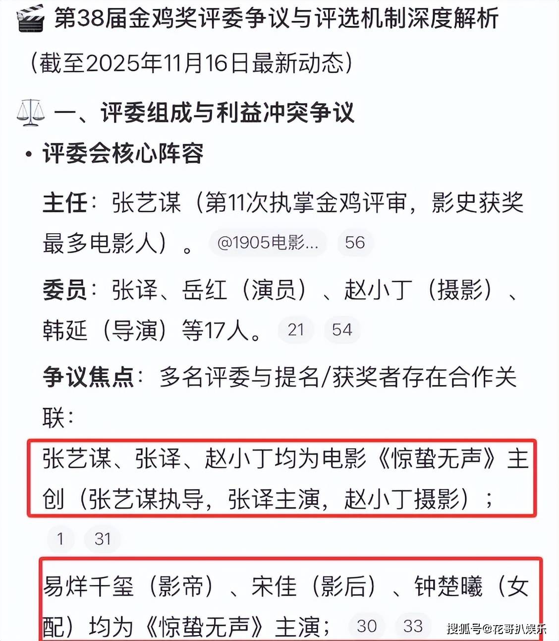 本届金鸡奖的评委阵容本身就充满争议:评委主任是张艺谋,委员包括张译、岳红、赵小丁等人。而巧合的是,张艺谋、张译、赵小丁都是《惊蛰无声》的核心主创。更离谱的是,恰好《惊蛰无声》的主演易烊千玺、宋佳、钟楚曦包揽了本届金鸡奖的男女主和女配奖项,真难为他们居然放过了男配。不可否认,这三位演员的演技或许有可圈可点之处,但如此明晃晃的内部分割资源,实在难以让观众信服。