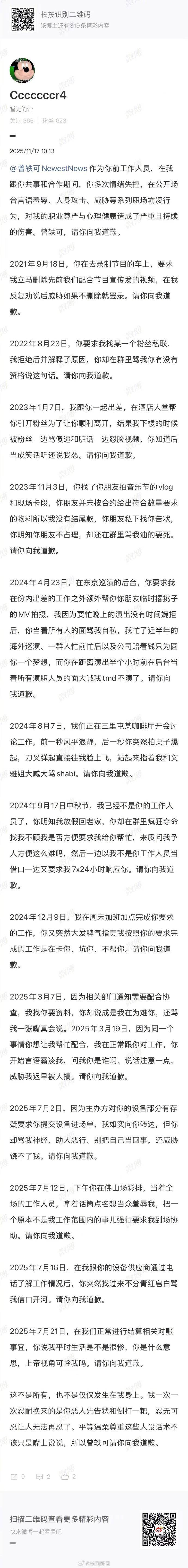 这篇控诉长文细节惊人:前员工指控曾轶可多次情绪失控,在2024年东京巡演后台因拒绝额外工作被骂“自私”并威胁罢演;同年8月在三里屯咖啡厅争执时拍桌致刀叉飞向员工面部。更提及2022年因拒绝私联特定粉丝遭群内辱骂“没资格说话”,甚至离职后仍被要求7×24小时响应工作,中秋佳节还被质问“予人方便这么难吗”。长文每段结尾都强硬要求曾轶可道歉,态度鲜明。