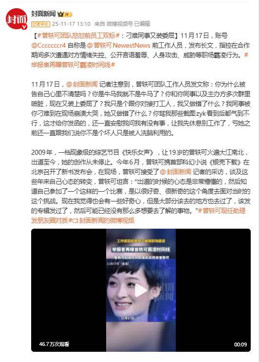 11月17日,一场围绕歌手曾轶可的职场纠纷在社交平台引爆舆论。自称是曾轶可前工作人员的账号@Cccccccr4发布长文,控诉在合作期间遭遇一系列职场霸凌,话题“#举报者再曝曾