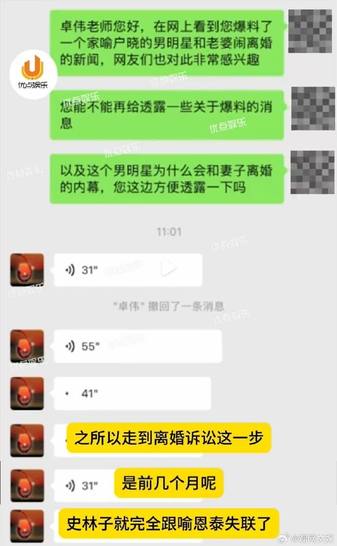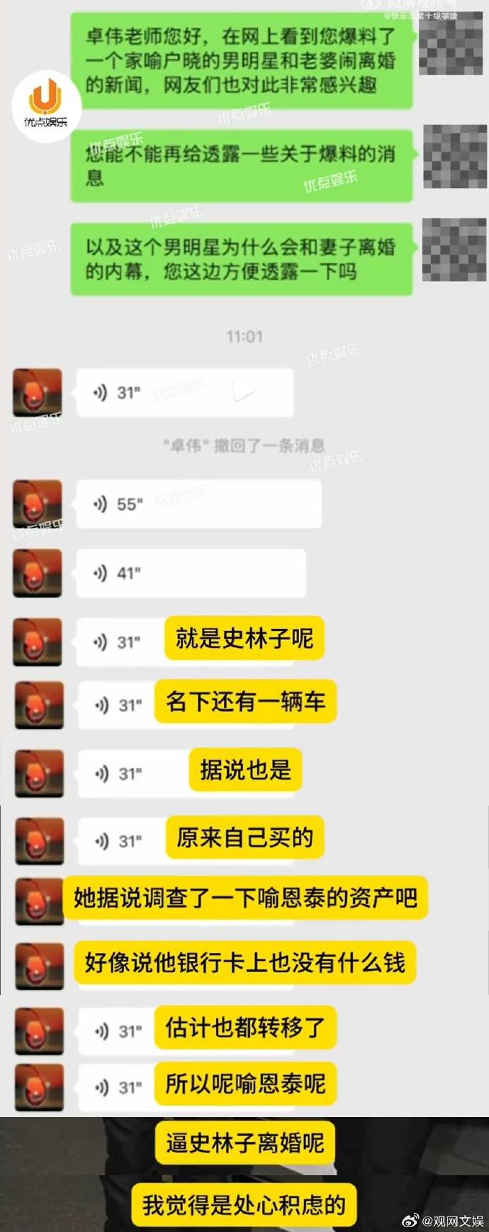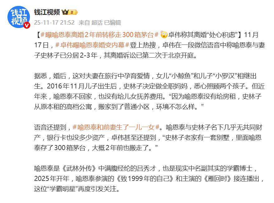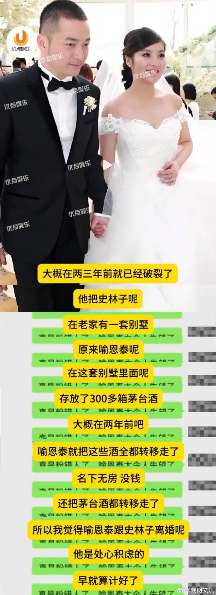 根据娱乐圈“第一狗仔”卓伟流出的微信语音,喻恩泰与妻子史林子已经分居两到三年,离婚诉讼已于北京第二次开庭。更劲爆的是,卓伟直言这对夫妻名下几乎没啥共同财产,银行卡里也没多少银子,甚至爆料“喻恩泰2年前就把存放在史林子老家别墅里的300箱茅台给搬走了”——这批“硬通货”估值高达500万,它们的去向成了本案最大的谜团。