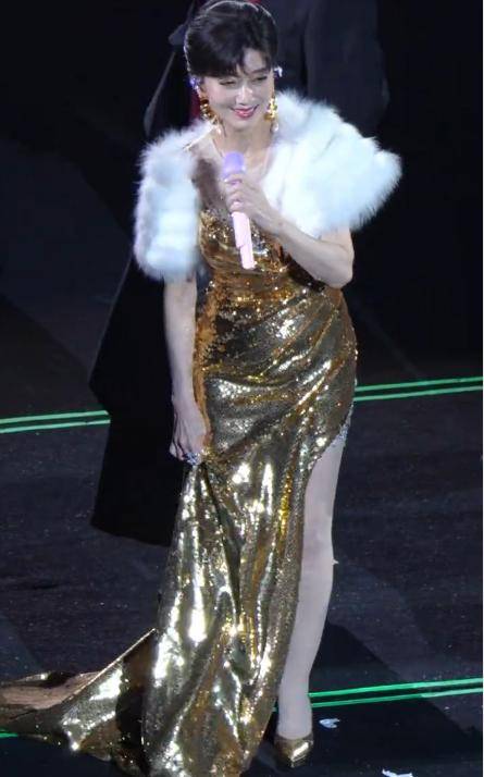 打鼓还不够,赵雅芝换了身金色开叉裙又跳起舞来。