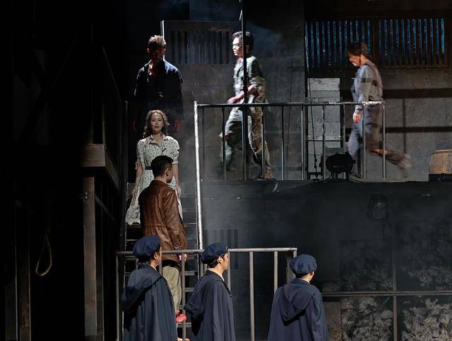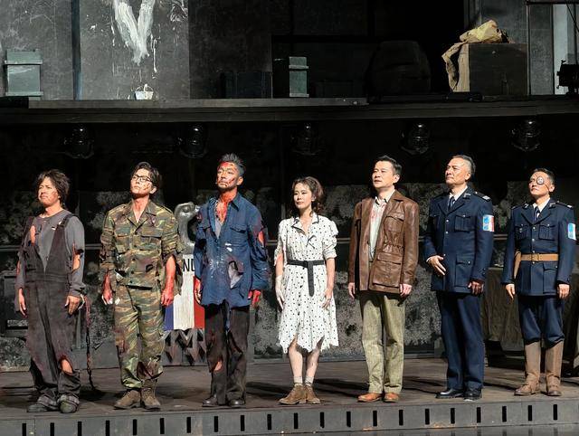 舞台上的她身着深色囚服,眼神坚毅地举着泛黄的信件,在冷色调灯光下将角色的绝望与抗争演绎得淋漓尽致。
