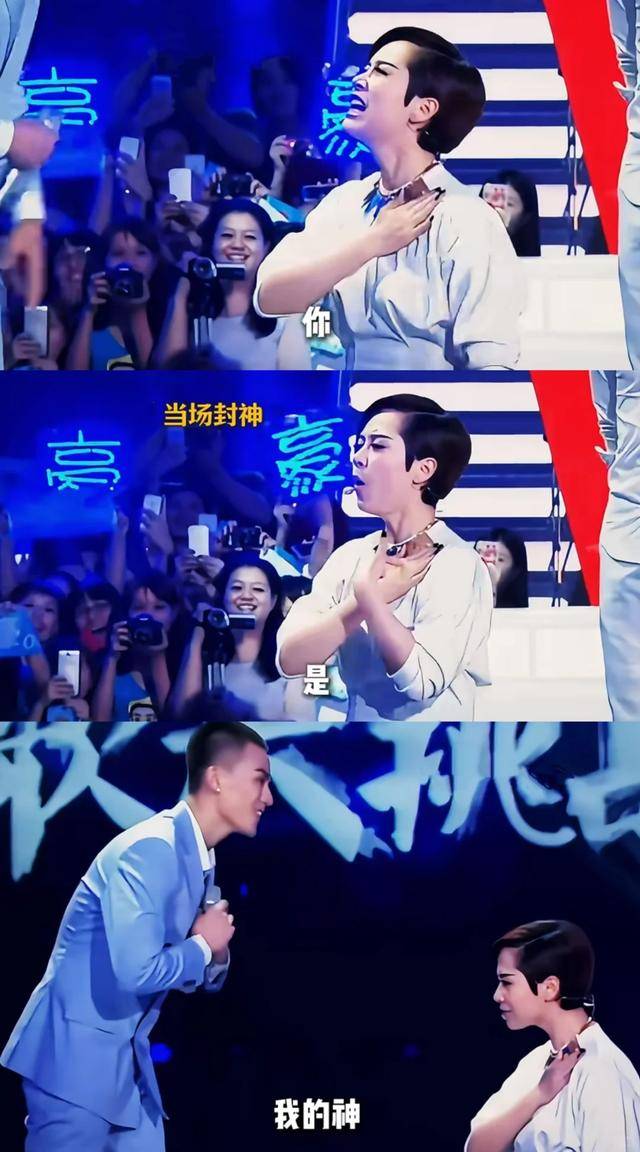 当时她作为V神给欧豪拉票,突然单膝跪地喊:“今天晚上我是V神,但此刻你是我的神!”