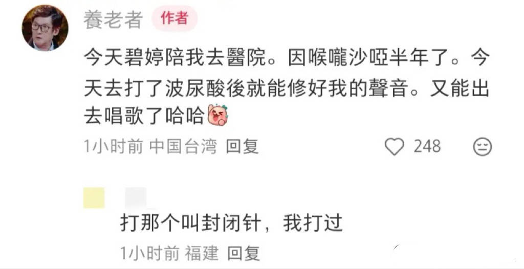 也有网友表示,那个叫封闭针,自己也打过。现在的医学真是太发达了,以前只知道嗓子哑了喝糖浆,现在都可以给嗓子打玻尿酸了。
