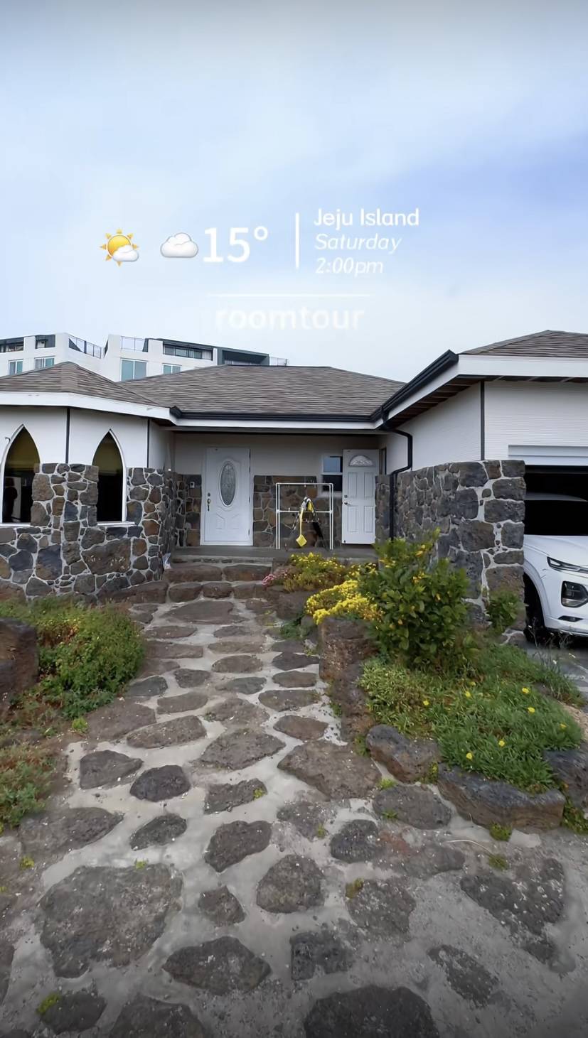 蔡琳在济州岛的房子很大、设计也很别致,像是独栋的别墅一样。石头墙、白色的墙面,还有拱形门,有一种很古朴的感觉,在这里让整个人的身心都放松下来。