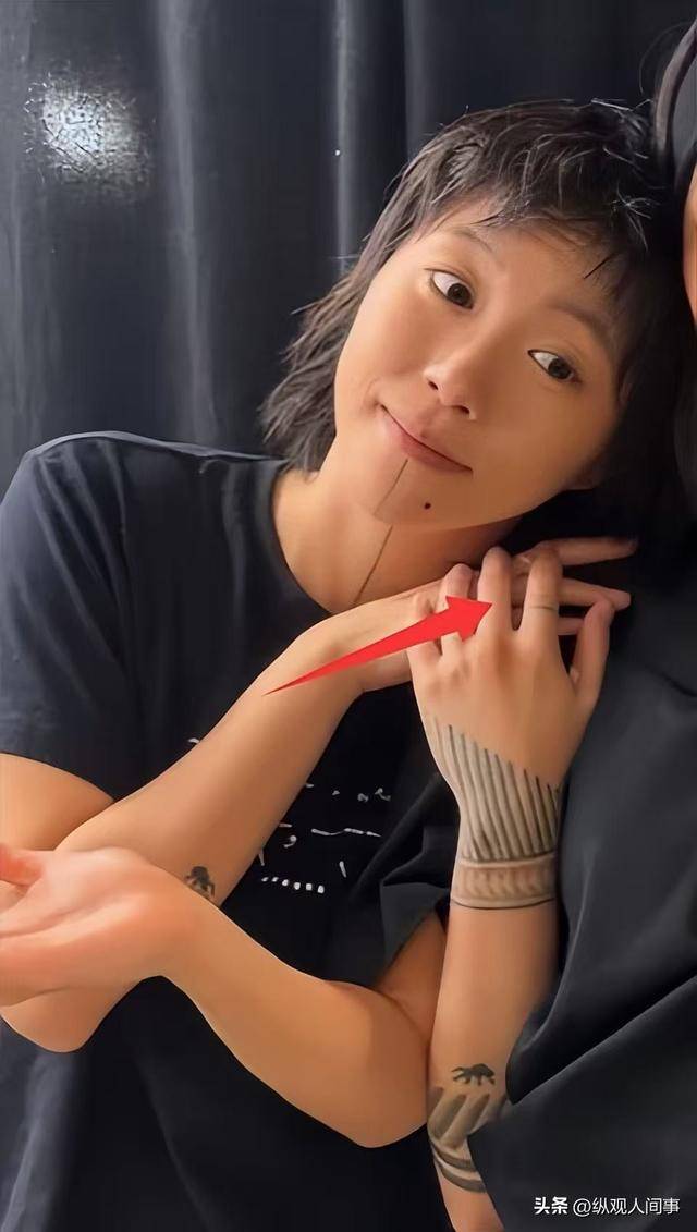 照片里,窦靖童站在最左边,黑色短发搭配黑色 T 恤,手臂上的纹身超抢镜,还有下巴上的“虾线”更是确认了是本人无疑。