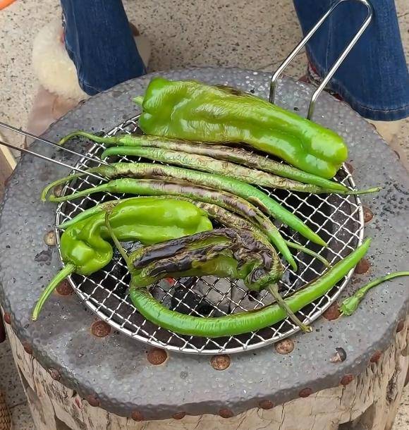 等到火生的差不多了之后,王一楠便把青辣椒放在了铁网上面开始烧烤,烤熟之后拿下来备用。