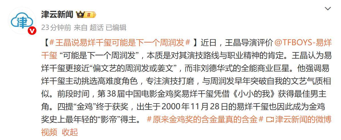 据11月19日报道,导演王晶一句“易烊千玺可能是下一个周润发”,瞬间点燃舆论。这已不是简单夸赞,而是直接将这位24岁的新晋金鸡影帝,与华语影坛的传奇人物对标,引发全网热议。