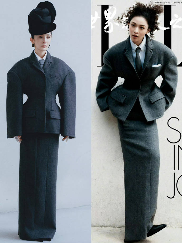 具体来看,这场“撞衫风波”的时间线成了关键。杨幂在《嘉人》10月刊(业内称为“银十封面”,发布于9月至10月)中率先上身这款设计,以冷艳神秘的复古帽饰搭配锐利眼神,展现出强大的攻击性美感。粉丝指出,这一造型与她主演的爆款剧《生万物》中“宁绣绣”的坚韧特质高度契合,进一步巩固了其“冷飒女王”的形象。