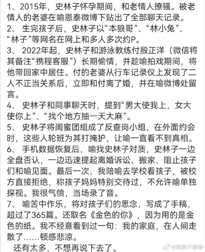 然而,剧情在11月18日发生颠覆。一位自称双方共同好友、账号名为“沉稳的石头爱摄影”的用户发布长文,直指史林子长期婚内出轨,并罗列了多项具体证据: