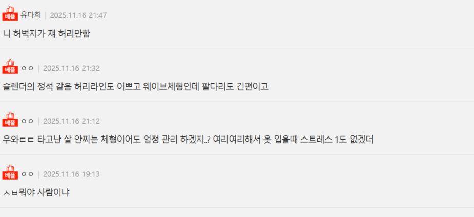 随手翻看评论区,几乎成了“身材震撼文学”现场。一条高赞评论直言:“你的大腿围都快赶上她的腰围了”,瞬间收获数千点赞。还有人细致分析道:“这简直就是纤细的代名词。腰线优美,拥有波浪型身材,四肢修长”,言语间充满了难以置信。