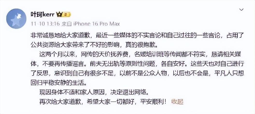 公开资料显示,1992年生于深圳的叶珂拥有多重身份:深圳大学毕业生、深圳广电集团电台原主持人、深圳市可心嘉禾科技有限公司董事长、深圳市女企业家商会理事。然而,2024年与黄晓明官宣恋情后,其被质疑整容及贬低经典歌曲等争议言论持续发酵,最终在同年11月10日,她通过微博发布长文道歉声明,以“身体不适及家人原因”决定退出网络,并否认“天价抚养费”“名媛培训班”等传闻。至11月20日,其社交平台已全面注销,为这场舆论风暴按下暂停键。