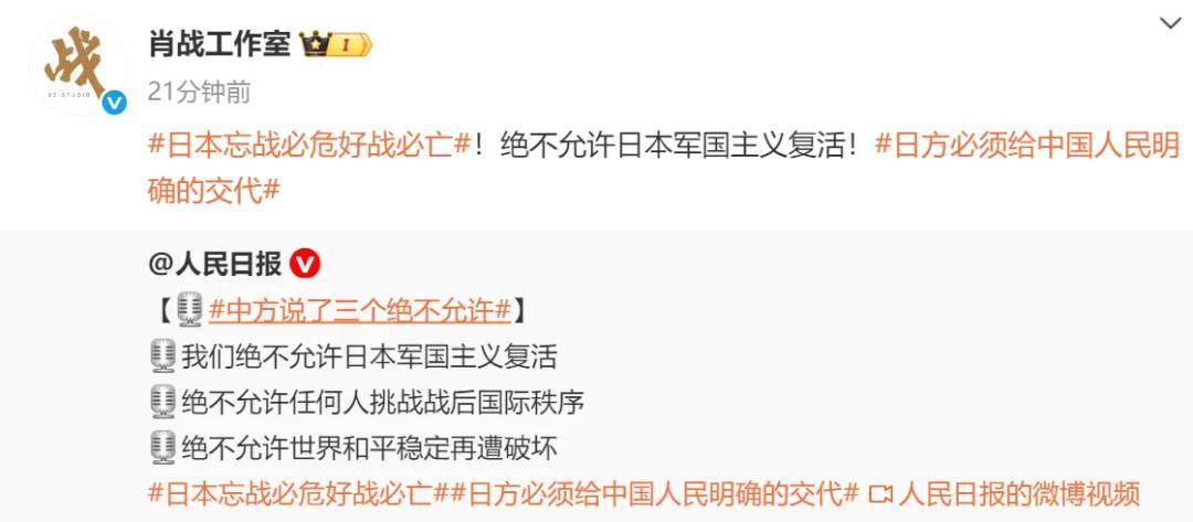 顶流肖战不仅本人转发,工作室还两次进行了转发,其中包括中方的三个绝不允许态度,要求日方必须给中国人明确的交代。